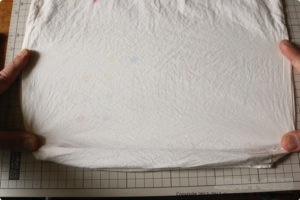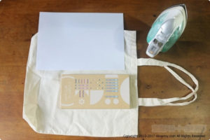(2)布に描いた絵の上にコピー用紙などの紙を敷き、100度以上の温度設定にしたアイロンをかける。熱でクレヨンが溶け、布の繊維に染み込み定着