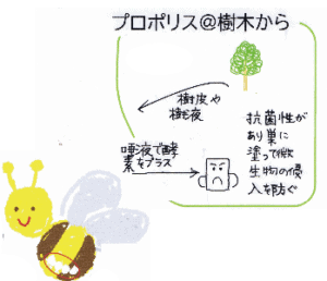 ![]() | ①原材料=木などから ワンポイント!花の蜜からはちみつと違って、木の樹皮や樹液からプロポリスです |